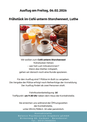 Am 06.02.26 unternimmt die Kontaktstelle Berenbostel einen Ausflug ins Café "unterm Storchennest" nach Luthe. Hier wollen wir gemeinsam Frühstücken.