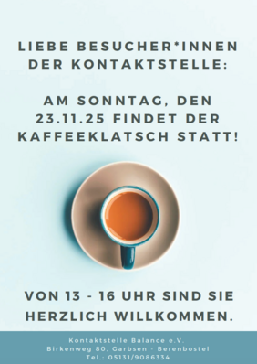 Am 23.11.25 lädt die Kontakstelle Garbsen Berenbostel zum Kaffeeklatsch von 13:00 Uhr bis 16:00 Uhr ein.
