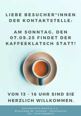 Am 07.09.25 findet wieder der Kaffeeklatsch in der Kontaktstelle Berenbostel statt. Von 13:00 bis 16:00 Uhr begrüßen wir Sie herzlich in unseren Räumen im Birkenweg 80.